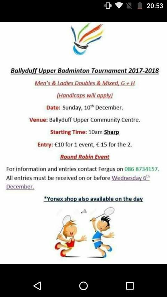 Friday Feb 20th Venue Cappoquin Section 1 Kilmacthomas V Waterford 1 7pm Court 3 & 4 Section 2 Waterford 2 V Kilmacthomas 2 7pm Court 1 & 2 Section 3 Tramore 1 V Tourin 3 7.30pm Court 2 Section 4 Tramore 2 V Dunmore 7.30pm Court 4 Section 5 Dunmore 3 V Tramore 3 8.15pm Court 1![]()